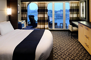 Two twin beds (can convert into queen-size), sitting area (some with sofa bed), private balcony, mini bar, private bathroom, vanity area, hair-dryer, closed-circuit TV and phone. Rates vary from deck to deck. Also referred to as Deluxe Ocean View Stateroom with Balcony. (204 sq. ft., balcony 41 sq. ft.)