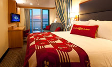The perfect home away from home, this room type features generous square footage and a private place to admire the view.Deluxe Oceanview Stateroom with Verandah classifications and locations are as follows:Category 5A: Decks 9 and 10Category 5B: Decks 7 and 8Category 5C: Deck 6Category 6A: Decks 8 and 9; private verandah with partial whitewallCategory 6B: Decks 5, 6 and 7; private verandah with partial whitewallCategory 7A: Decks 5, 6, 7, 8, and 9; enclosed verandah with limited viewsSpecificationsSleeps: 3 to 4Size: 246 sq. ft., including verandahRoom Configuration: queen bed, single sleeper sofa and upper-berth pull-down bed (if sleeping 4)View: private verandahAmenitiesCustom Premium Plush Euro-top mattressFrette® 300-thread-count, 100% cotton linensPremium bath towels22" LCD flat-screen TV on swivel arm, with remote controliPod® docking stationFull-length mirrorAmple closet spaceRefrigeratorIn-room safeHair dryerPhone with voicemail messagingIndividual climate controlSignature spa, bath and shower productsWiFi (additional fee required)DesignDisney Cruise Line has thought of everything to ensure first-rate comfort and convenience during your voyage. Deluxe Oceanview Stateroom with Verandah design features include:A sitting area with a couch, TV and deskA heavy privacy curtain to separate the sitting and sleeping areasA “split bath” (in most): a bathroom with a vanity, sink, shower and tub and a half bathroom with a vanity, sink and toiletElevated wooden bed frames for under-bed storage of suitcases and other large itemsA leather-upholstered ottoman with hollow inside storageAttractive yet functional cabinetry in the living areaVerandahAiry and private, this sanctuary is where you can watch the sun rise, bask in ocean breezes and enjoy your morning coffee or an evening nightcap.Your private balcony comes equipped with:Patio furnitureDeck lightingPlexiglas® or solid whitewall railingsChildproof locksOn most adjoining accommodations, the partition between verandahs can be opened to create a larger balcony for sharing, with access between rooms. Guests may contact their stateroom host to unlock the partitions.